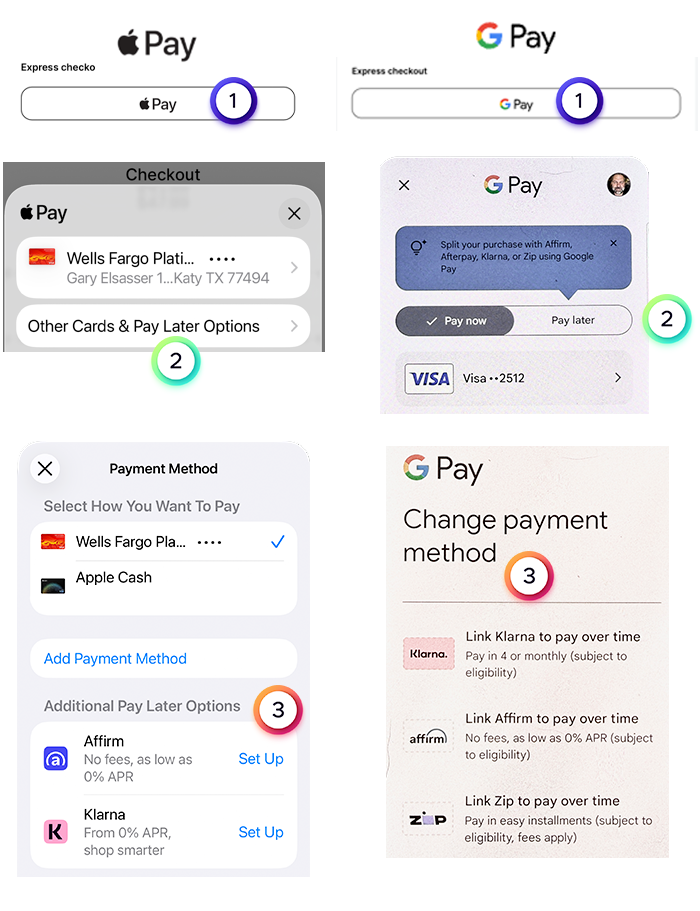 For customers with Android or Google Chrome, in the Square order, select the (1) Google Pay option, then select (2) Pay Later if order is $35 or higher, then (3) Choose one of the Pay Later Options Klarna, Affirm or Link Zip.